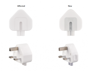 Apple Operations International Limited is carrying out a voluntary recall of the Apple three- prong AC wall plug adapter designed primarily for use in the U.K. Due to certain repeated impacts to the wall plug adapters, they may be susceptible to breakage which exposes internal electrical components. As a result there is a potential risk of a user sustaining an electric shock if an individual comes into contact with those exposed components.