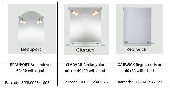 B&Q Ireland Ltd. are carrying out a voluntary recall of three ‘Cooke & Lewis’ branded mirrors. The safety concern identified is that “…in some circumstances the safety backing may be ineffective or missing. This may result in the mirror detaching from the fixings and falling. Additionally the shelves supplied are not toughened glass. Both these concerns present a risk of cuts should the glass break. For products with lights this could result in live wires becoming exposed presenting a risk of electric shock.”