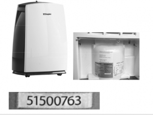 Affected products can be identified be the serial number, which can be located on the product rating plate. This is accessible by removing the water tank (see images above). Affected products have a serial number starting with 501 through 522. Dehumidifiers with a different model number or that start with a different serial number are not affected.