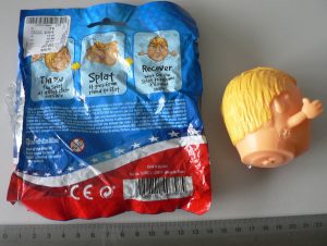 Description: A ball designed as the head of President Trump with arms, made of orange-coloured, soft, elastic, synthetic material, diameter: 5-7 cm, filled with a colourless liquid.