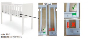 If the bottom rail, with blocks on which you sit the base, is longer than the top rail then your crib is unsafe and should be returned to store, picture B.