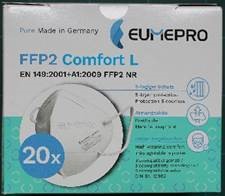 The brand is EUMEPRO. The ASIN numbers are B09GXGRC6X, B09GXGS3PV and B09GXP72J4. The Type/number of models is Comfort L FFP2 NR. The batch number is 500520/1-1. The barcode is 4260685420357.