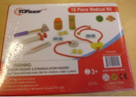 A safety issue has been identified, whereby, it is possible that this product may present a serious risk to very young children. Due to the possibility of small parts in the toys imitation medication, a potential choking hazard exists. This ‘Toy Doctors Set’ includes a toy syringe, thermometer, stethoscope, and imitation medication. There are a total of 10 pieces in this set. The barcode on the product is 819116020112.