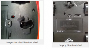 Tesco advise that “…the small directional wheel underneath the vehicle can become detached from the body of the vehicle. The small wheel has the potential to become a choking hazard.”